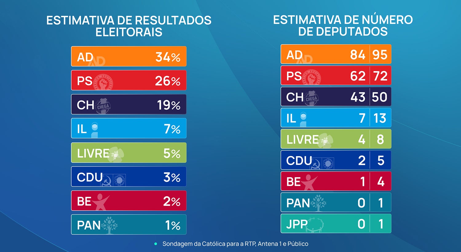 Quanto aos restantes partidos, a IL deverá ter entre 7 e 13 parlamentares, o Livre um grupo entre 4 e 8 e a CDU (2-5) a superar o BE (1-4). No fim desta tabela do número de deputados à Assembleia da República, PAN e JPP surgem com duas possibilidades, zero e um deputado, o que para a formação de Inês Sousa Real representa o risco de desaparecimento e para a formação madeirense, pelo contrário, a possibilidade de estreia no Parlamento nacional.