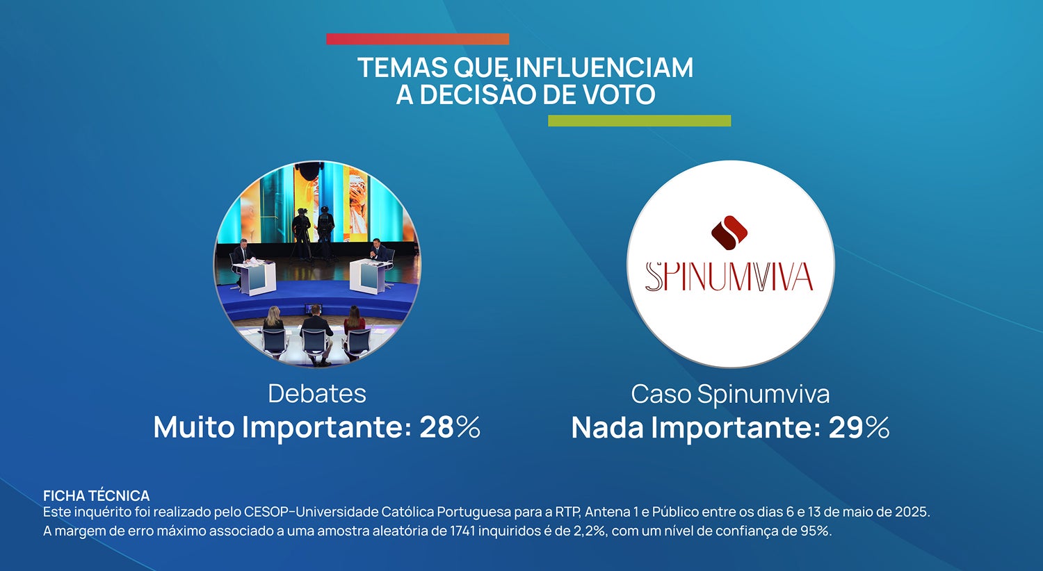 Este inquérito foi realizado pelo CESOP–Universidade Católica Portuguesa para a RTP, Antena 1 e Público entre os dias 6 e 13 de maio de 2025. O universo alvo é composto pelos eleitores residentes em Portugal. Os inquiridos foram selecionados aleatoriamente a partir duma lista de números de telemóvel, também ela gerada de forma aleatória. Todas as entrevistas foram efetuadas por telefone (CATI). Os inquiridos foram informados do objetivo do estudo e demonstraram vontade de participar. Foram obtidos 1741 inquéritos válidos, sendo 44% dos inquiridos mulheres. Distribuição geográfica: 33% da região Norte, 21% do Centro, 32% da A.M. de Lisboa, 6% do Alentejo, 4% do Algarve, 2% da Madeira e 2% dos Açores. Todos os resultados obtidos foram depois ponderados de acordo com a distribuição da população por sexo, escalões etários, região e comportamento de voto com base nos dados do recenseamento eleitoral e das últimas eleições legislativas. A taxa de resposta foi de 25%*. A margem de erro máximo associado a uma amostra aleatória de 1741 inquiridos é de 2,2%, com um nível de confiança de 95%.