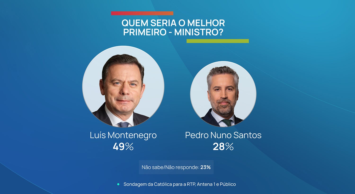 Há um ano, aquando do primeiro confronto entre os líderes das principais formações partidárias, os dados da Católica apontavam para 46% a considerar que o melhor primeiro-ministro seria Luís Montenegro, enquanto 34% dava preferência a Pedro Nuno Santos.