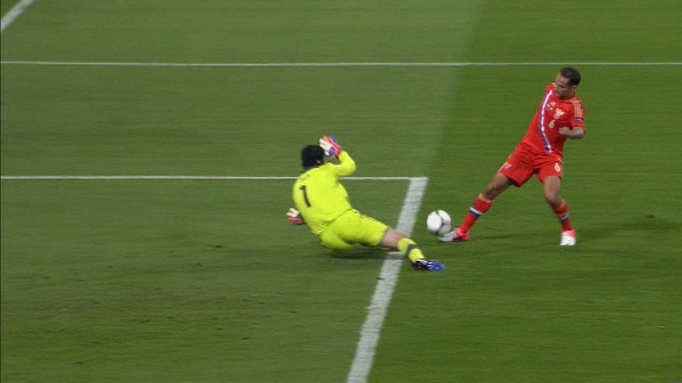- Dzagoev desperdiça! Falha de marcação da defesa checa que deixa o autor do golo russo isolado perante Cech que faz a mancha e intimida o adversário que atira à malha lateral.