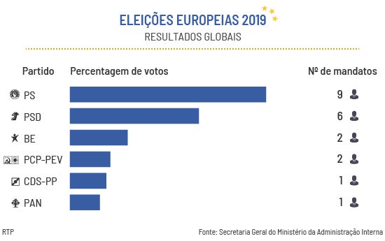 O PS elegeu 9 eurodeputados, o PSD 6, o Bloco de Esquerda 2, o mesmo que a CDU, que também elegeu 2.