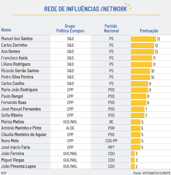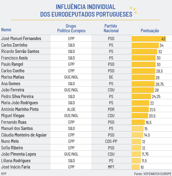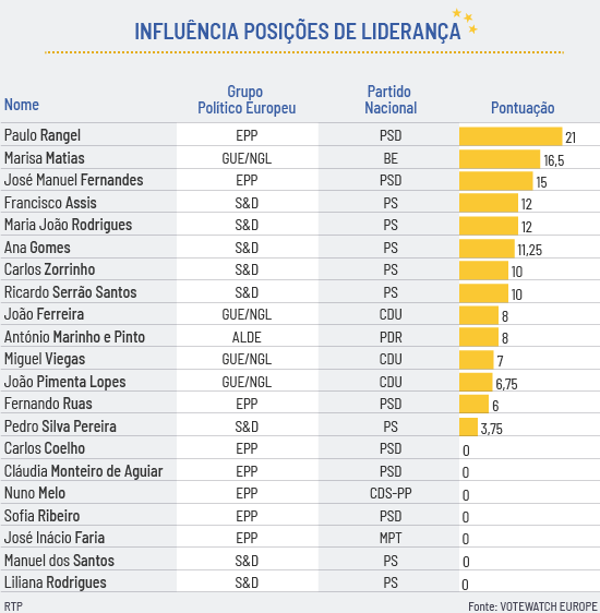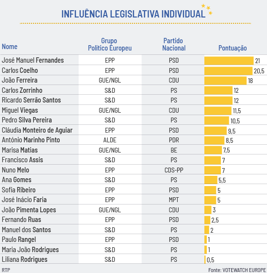 O PSD tem, nos dois primeiros lugares, os dois eurodeputados mais influentes no que se refere a moldar a legislação: José Manuel Fernandes e Carlos Coelho seguidos por João Ferreira da CDU. Marisa Matias (10ª) e Nuno Melo (11.º) aparecem no meio da tabela.