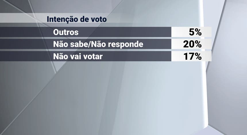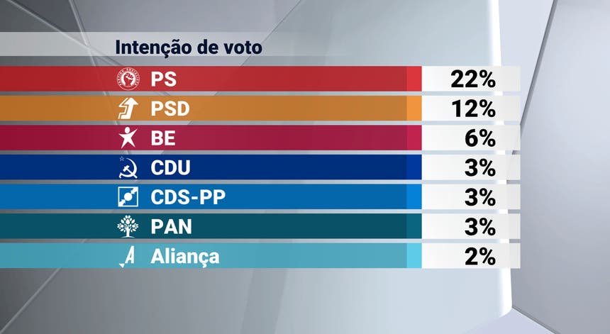 Na presente sondagem, a intenção direta de voto é de 22 por cento para o PS, 12 por cento para o PSD, 6 por cento para o BE, 3 por cento tanto para a CDU como para CDS-PP e PAN. O Aliança alcança 2 por cento das intenções diretas de voto, enquanto as restantes listas representam 5 por cento das intenções.