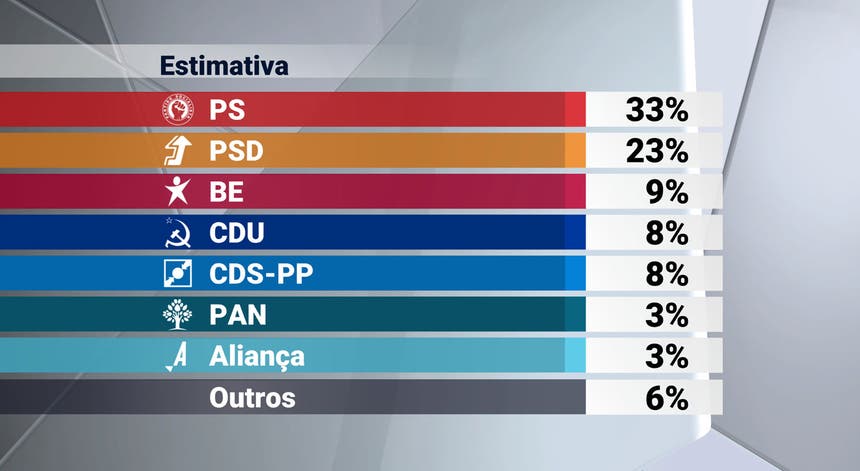 Os dados da sondagem do CESOP-Universidade Católica Portuguesa para a RTP apontam para uma estimativa de resultados eleitorais de 33 por cento para os socialistas e de 23 por cento para os sociais-democratas. A sondagem foi realizada entre os dias 16 e 19 de
