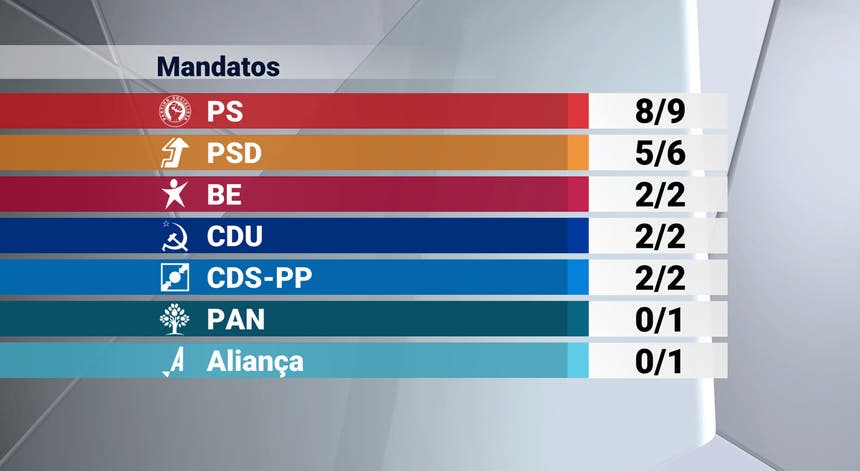 Traduzindo as estimativas eleitorais desta sondagem para mandatos, significaria que o PS elegeria 8 a 9 eurodeputados, enquanto o PSD conseguiria 5 ou 6 mandatos.