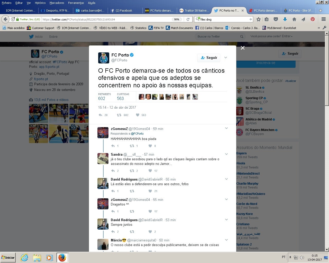 FC Porto reagiu esta quarta-feira ao cântico da claque dos 'dragões' que durante um jogo com o Benfica para o Nacional de Andebol no Dragão Caixa está a gerar polémica pelo texto de um cânticos.