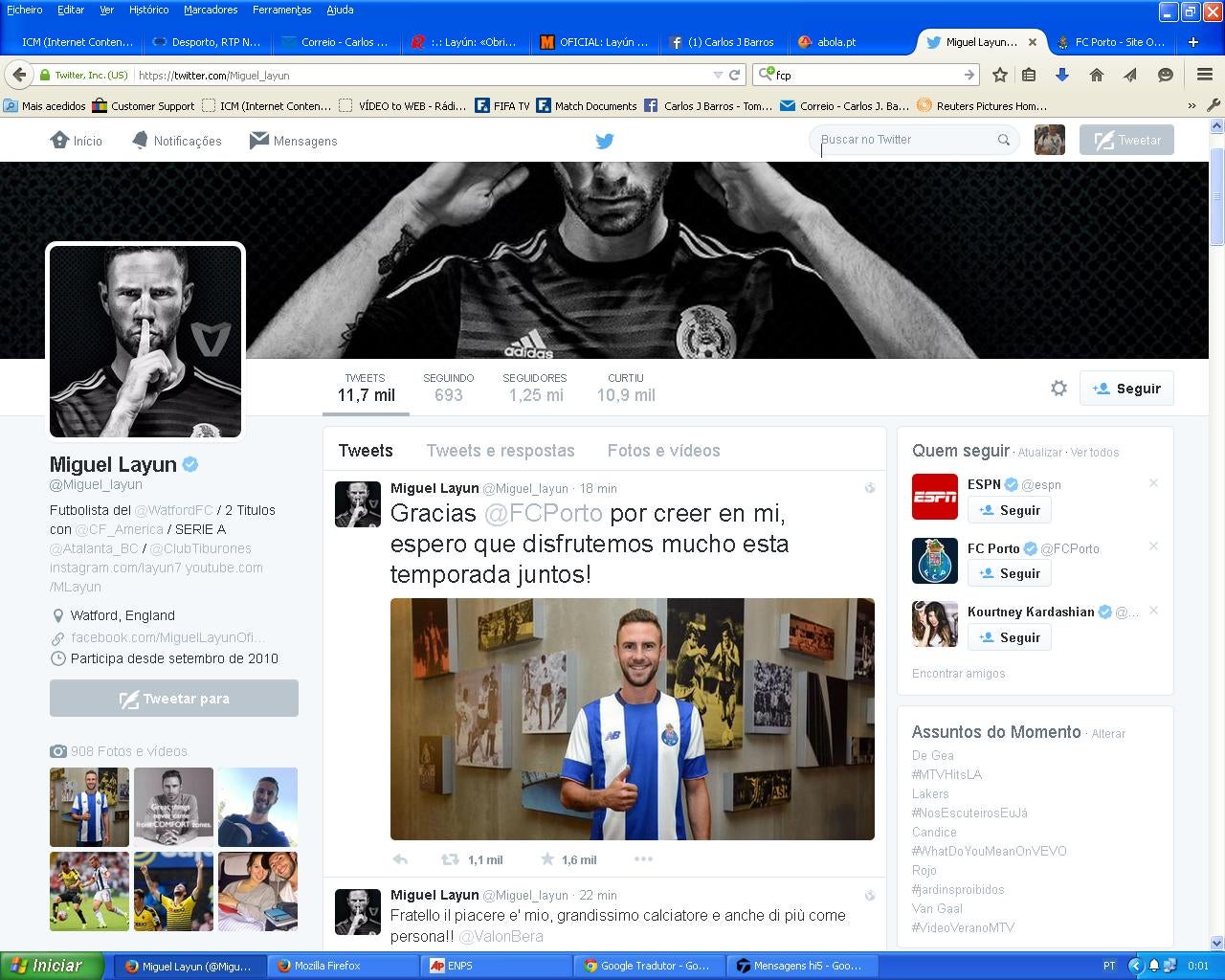 Miguel Layún utilizou a sua página na rede social Twitter para agradecer aos dragões pela aposta feita em si.