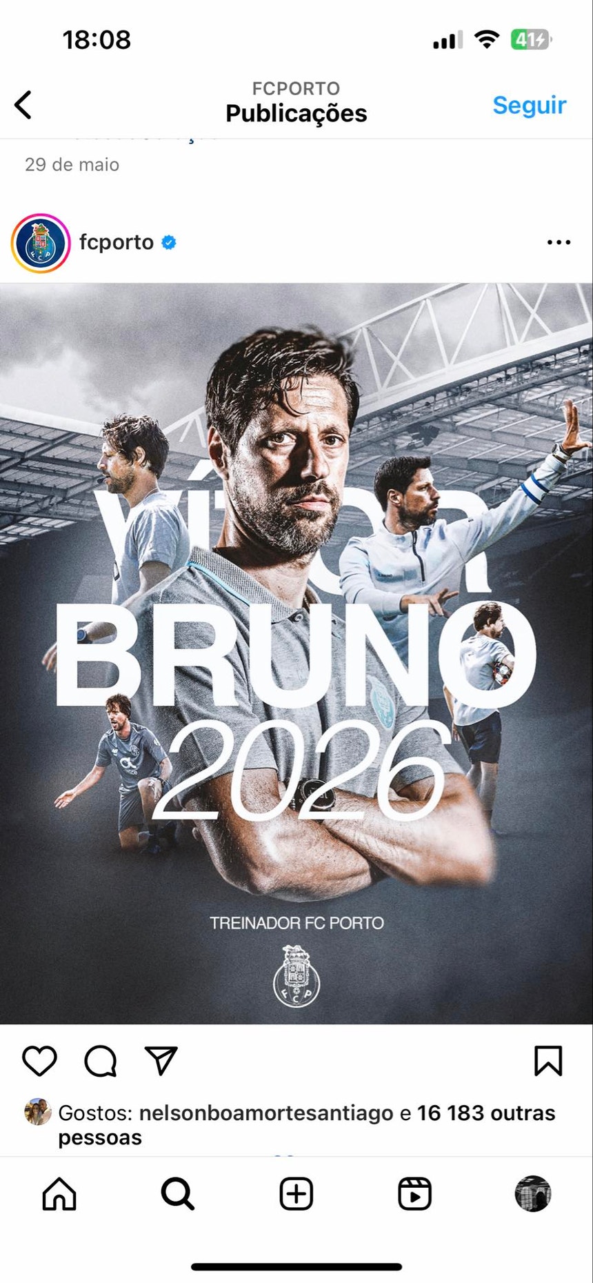 "A Futebol Clube do Porto – Futebol, SAD informa, para os efeitos do disposto no número 1 do artigo 17.º do Regulamento (UE) n.º 596/2014 do Parlamento Europeu e do Conselho, de 16 de abril, que chegou a acordo com Vitor Bruno Clara Santos e Motas Fernandes para a celebração de um contrato de trabalho, como treinador da sua equipa principal de futebol, válido por 2 épocas desportivas (2024/2025 e 2025/2026).