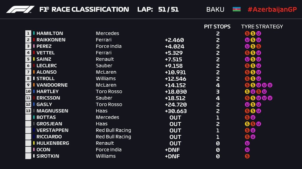 A vitória de Hamilton em Baku, significa que temos agora três vencedores diferentes nas primeiras quatro corridas deste ano.   Bottas viu uma tática extraordinária e uma execução até aí perfeita, esfumar-se com um furo. Mercedes queria prolongar ao máximo pitstop de Bottas para atacar no final de corrida a vitória, com pneus novos e ultramacios.