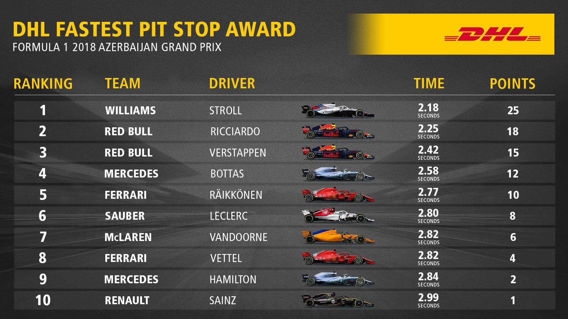 * Lewis Hamilton – 63ª vitória de carreira (1ª da temporada 2018). É o 2º piloto com mais vitórias da história. 1ª Vitória em Baku, Azerbaijão.