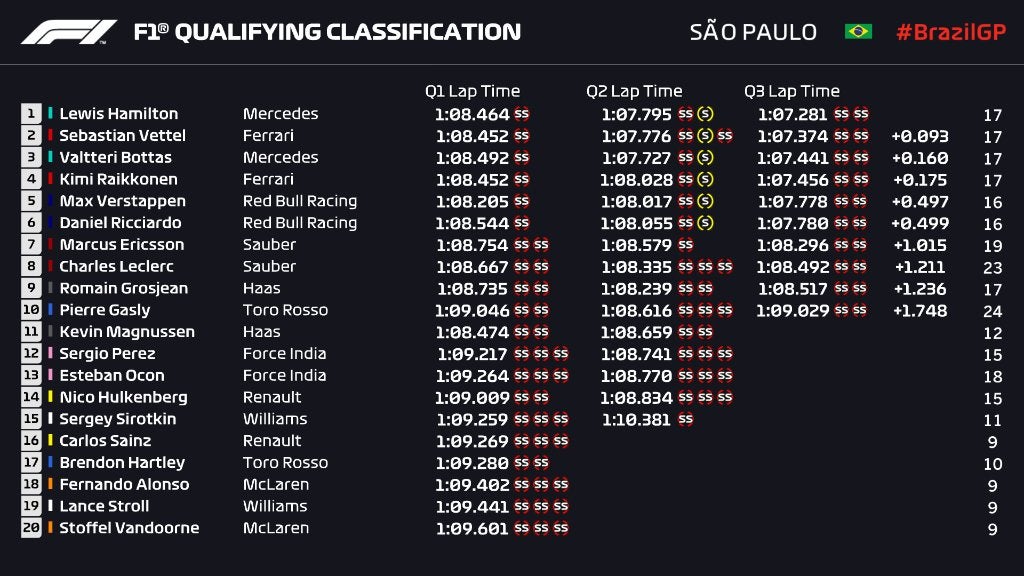 Caso um e outro sofram penalizações pelos incidentes, então a 1ª fila do GP do Brasil terá uma dupla de finlandeses. Valtteri Bottas e Kimi Raikkonen nos outros Mercedes e Ferrari, reseptivamente, fizeramo terceiro e quarto tempos da sessão.