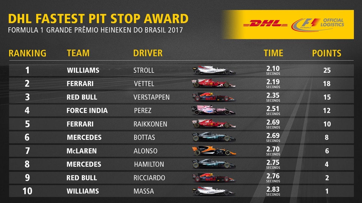 A Williams que o ano passado foi a mais rápida escuderia no maior número de GPs, tem tido uma segunda metade de temporada que não tem sido a melhor, vendo a Mercedes a assumir-se como a mais eficaz nos PitStops. Mas com a vitória no Brasil, mete pelo 2º ano consecutivo no bolso o maior número de vitórias na época. Esta foi a 8ª e já não perder para a Mercedes. Porém, a equipa campeã do mundo de F1 é a que tem melhor média de pontuação entre os múltiplos pitstops feitos na época. No Brasil, atrás do Pit Stop de lance Stroll, ficou a paragem da Ferrari para Vettel e a da Red Bull para Verstappen.