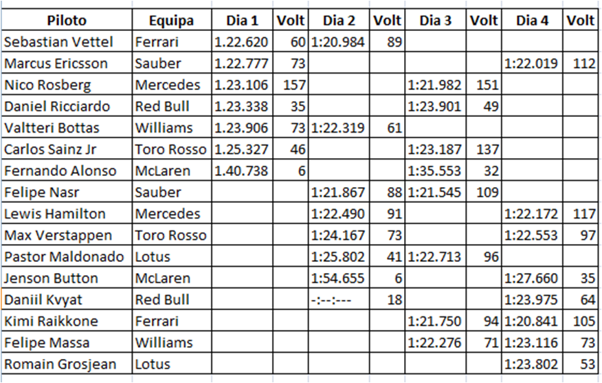 (Médio), Nasr 1.21.545 (Macio), Rosberg 1.21.982 (Médio), Ericsson