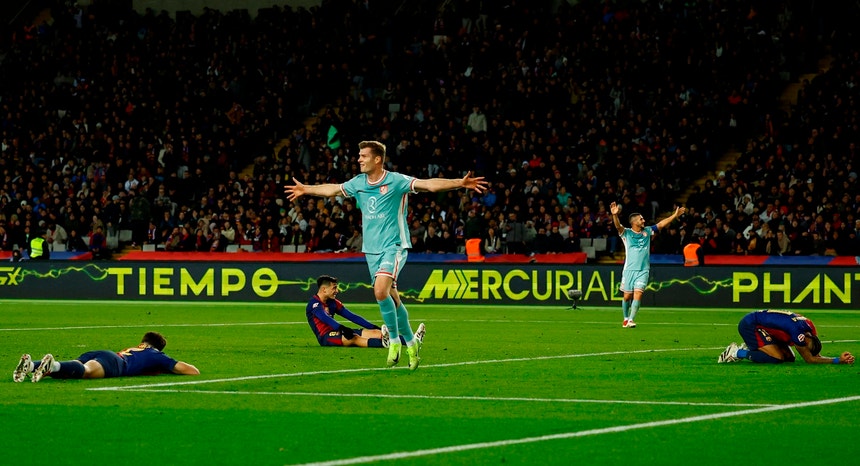 Um golo do norueguês Sorloth, que saltou do banco na segunda parte, aos 90+6 minutos, num contra-ataque nos derradeiros segundos do encontro, decidiu a contenda, depois de o 'Barça', que nas últimas sete jornadas só venceu uma vez, ter marcado primeiro, por Pedri, aos 30 minutos, tendo o argentino De Paul empatado, aos 60.