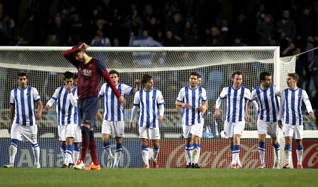 A Real Sociedad chegou à vantagem com um autogolo do camaronês Alexandre Song (1-0), aos 32 minutos, substituído aos 61 por Fábregas, mas ainda antes do intervalo o Barcelona chegou ao empate pelo argentino Lionel Messi (1-1), aos 36.