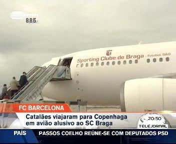 O Barcelona apanhou boleia do Braga. Foi nas asas dum avião decorado com o nome do Sporting de Braga que o Barcelona viajou até Copenhaga, para mais um jogo da Liga dos Campeões.O avião é o mesmo que transportou a equipa minhota a Londres onde acabou por ser goleada frente ao Arsenal por 6-0. O adorno fez com que o presidente do Barcelona, Sandro Rossel exigisse explicações ao organizador da viagem, que terá apresentado um pedido de desculpas.