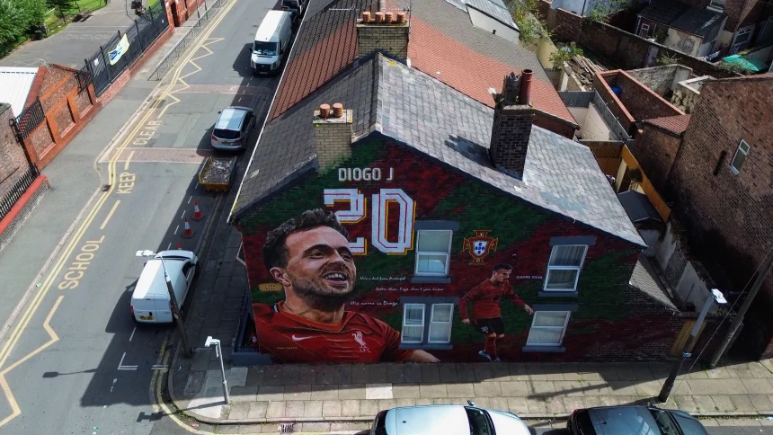 Um mural na lateral de uma casa junto ao Estádio de Anfield Road, em homenagem ao futebolista Diogo Jota, que morreu em um acidente de viação com o seu irmão André Silva, foi concluído pelo artista Paul Curtis.