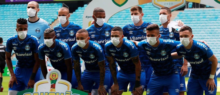 Os jogadores do Grémio e equipa técnica usaram máscaras faciais minutos antes da receção ao São Luiz, do Campeonato Gaúcho de futebol, como forma de apelar à interrupção das competições, devido ao surto da Covid-19.