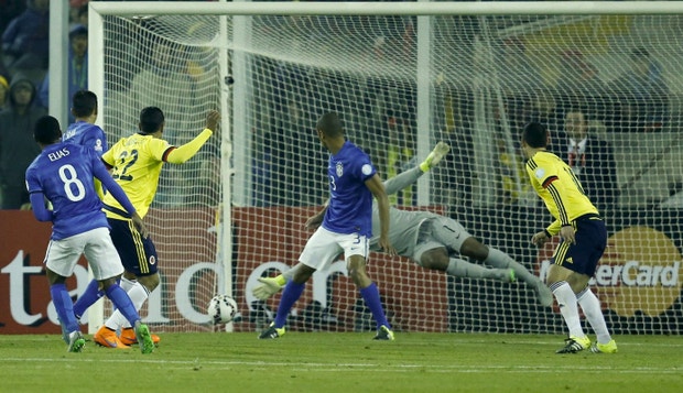O tento foi apontado aos 36 minutos e permitiu aos colombianos relançarem-se na competição e acabar com o trajeto 100 por cento vitorioso do Brasil na segunda passagem de Dunga pelo "escrete" como selecionador.