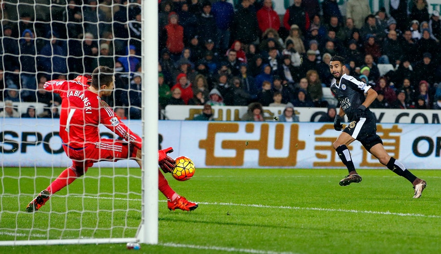 Três golos do argelino Riyad Mahrez isolam o Leicester no comando da Liga inglesa de futebol, ao consumar a vitória por 3-0 no estádio do Swansea, que permitiu capitalizar a derrota do Manchester City na 15.ª jornada.