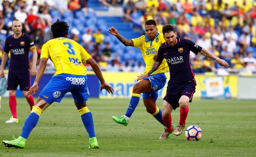 Las Palmas com bandeira espanhola no equipamento frente ao Barcelona