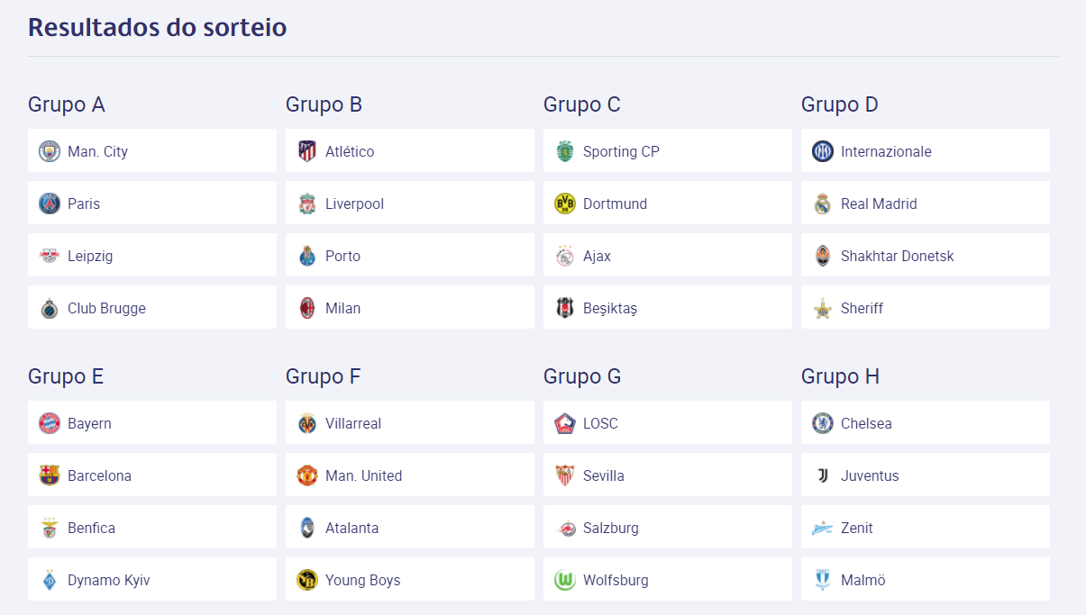 Inter Milão (Ita), Real Madrid (Esp), Shakhtar Donetsk (Ucr), Sheriff (Mol).