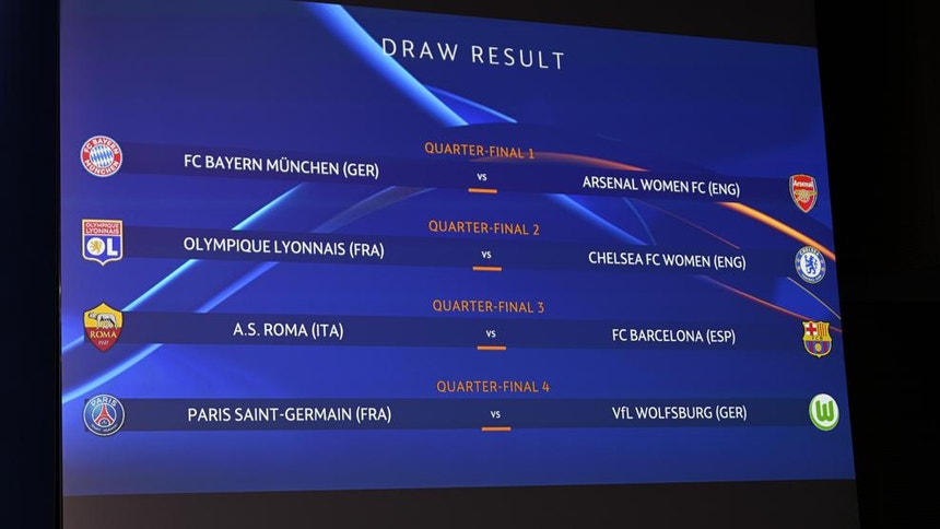 As equipas que foram segundas na fase de grupos, casos de Lyon, Bayern Munique, Roma e Paris Saint-Germain iniciam os "quartos" na condição de anfitriãs e disputam a segunda mão fora com os vencedores dos grupos, Arsenal, Chelsea, Barcelona e Wolfsburgo.