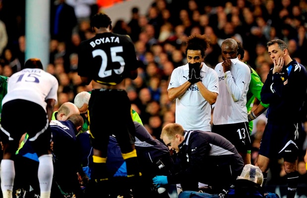 O jogador permanece em estado crítico na unidade de cuidados intensivos do Centro de Ataque Cardíaco do Hospital London Chest, depois de ter sofrido um colapso aos 42 minutos do jogo de sábado entre Tottenham e Bolton, dos quartos de final da Taça.