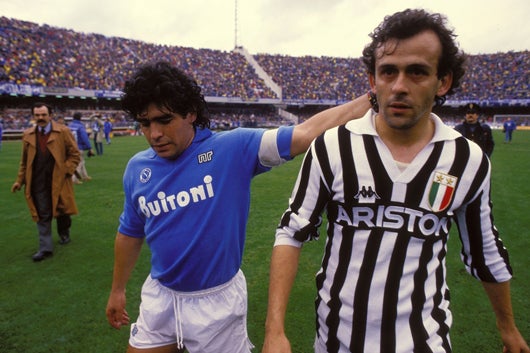 Legenda: Maradona cumprimenta Platini, quando os dois jogavam em Itália
