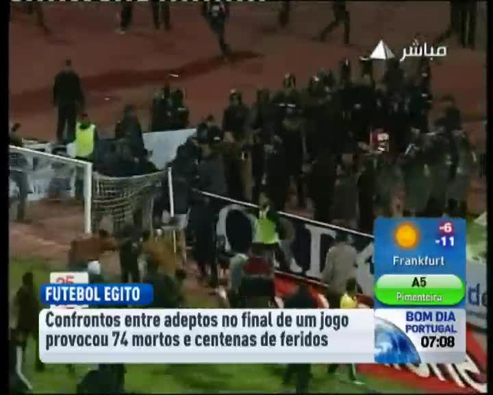 Setenta e quatro mortos e 188 feridos é o balanço oficial dos confrontos registados em Port Said, Egito, no final do jogo de futebol entre do Al-Ahly, treinado pelo português Manuel José, e o Al-Masry. Os números foram avançados em comunicado pelo o governo egípcio, que dá conta da morte de um polícia e da detenção de 47 pessoas, enquanto a Irmandade Muçulmana responsabilizou os apoiantes do antigo presidente, Hosni Mubarak, pelos atos de violência.