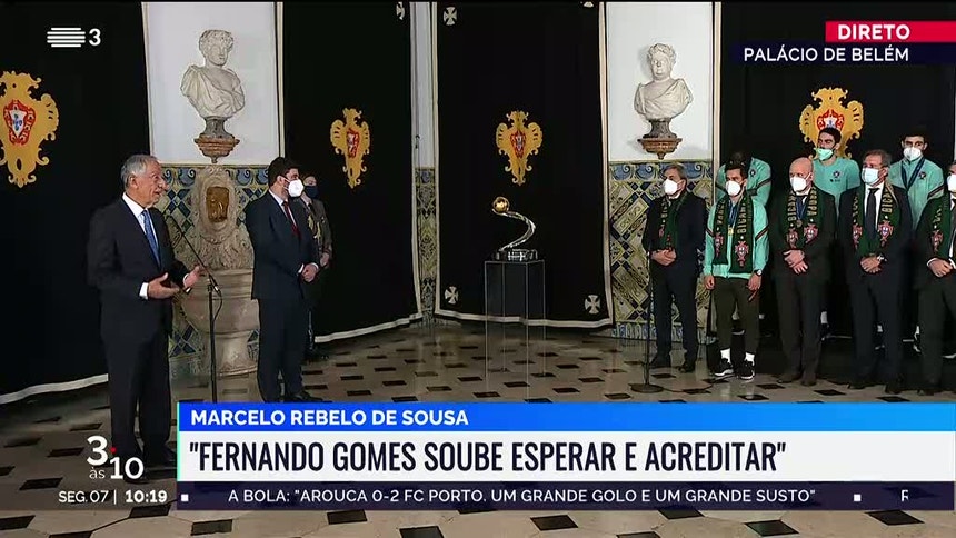 A equipa nacional foi recebida em Belém pelo Presidente da República, que deixou elogios à equipa e à Federação pelas condições criadas para que pudesse ser percorrido este caminho de sucesso. Antes da homenagem de Marcelo Rebelo de Sousa, falaram em nome da seleção o presidente da Federeação Portuguesa de Futebol, Fernando Gomes, e o capitão da equipa nacional, João Matos.