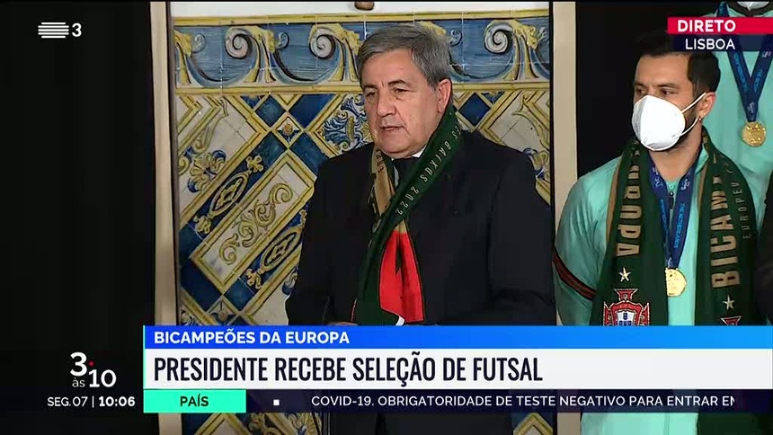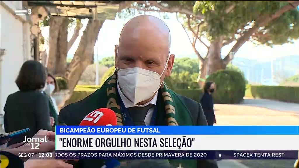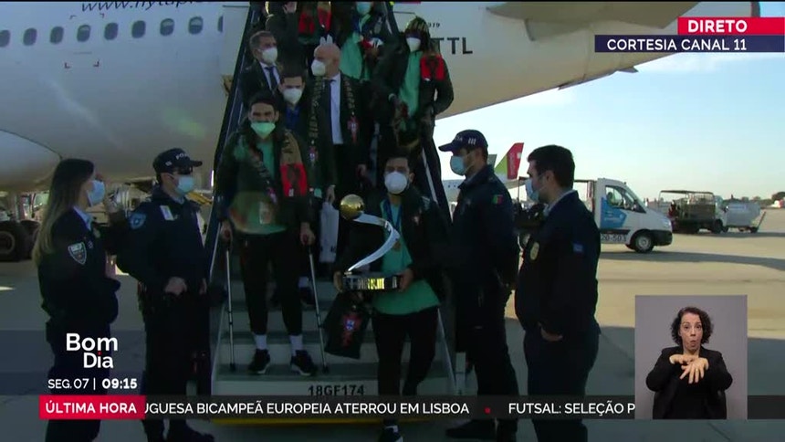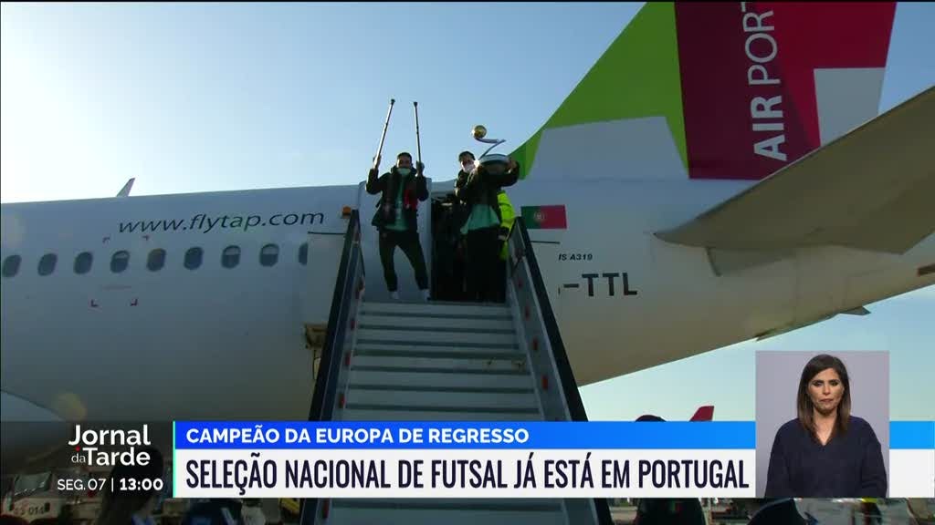 A comitiva campeã europeia de futsal regressou esta segunda-feira de Amesterdão, onde na véspera revalidou o título com uma vitória na final frente à Rússia por 4-2. A seleção chegou ao Aeroporto de Lisboa pouco antes das 9h00 e foi depois recebida em Belém pelo presidente da República.