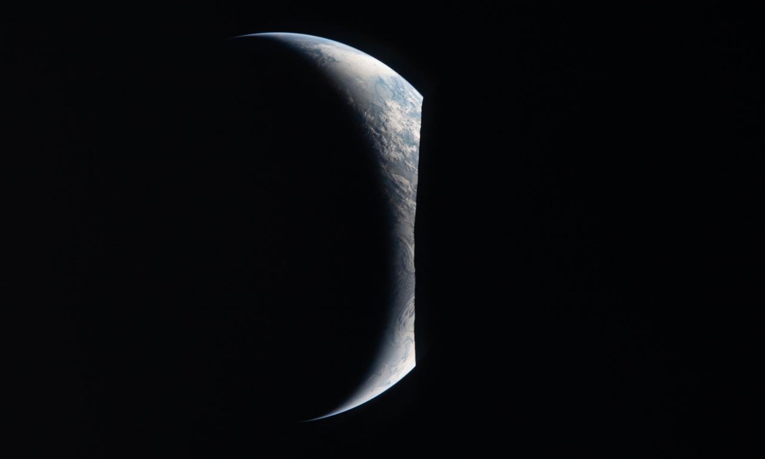 Pôr-do-sol da Terra capturado pela janela da Orion no dia 6 de abril de 2026, durante a passagem da tripulação da missão Artemis II pela Lua. Uma Terra azulada e discreta, com nuvens brancas brilhantes, se põe atrás da superfície lunar repleta de crateras. Crédito da imagem: NASA