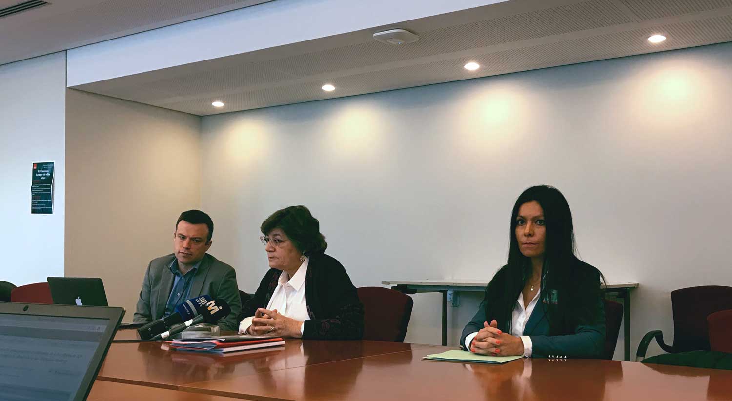 Na conferência organizada pela eurodeputada Ana Gomes sobre Moçambique. À esquerda está Tom Gibson da Comissão de Proteção de Jornalistas. À direita está Salomé Sebastião.