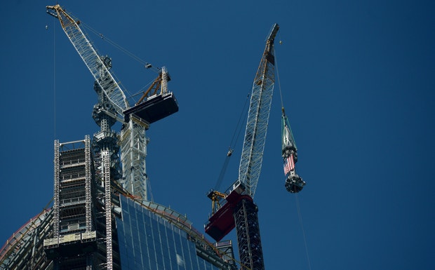 Operários aplaudiram e fotografaram à medida que um guindaste içava uma das últimas peças da torre One World Trade Center: uma espiral que será colocada no cimo do edifício, tornando-o o mais alto do hemisfério norte.
