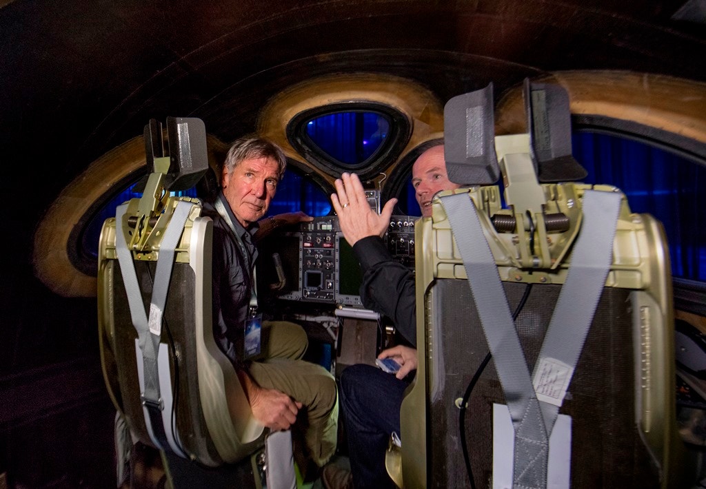 O ator e piloto Harrison Ford escuta as instruções de como tudo funciona no novo aparelho da Virgin Galactic