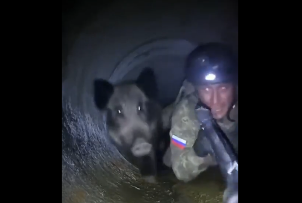 A Russian soldier unexpectedly meets with a wild boar inside an underground pipeline near Kupiansk, Ukraine. pic.twitter.com/jE1lwC2gpR