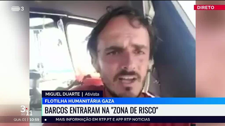 A flotilha internacional de ajuda humanitária, que tenta dirigir-se a Gaza, entrou numa zona de alto risco. O ativista Miguel Duarte confirmou esta quarta-feira à RTP que os navios estão a pouco mais de 100 milhas náuticas de distância do território.