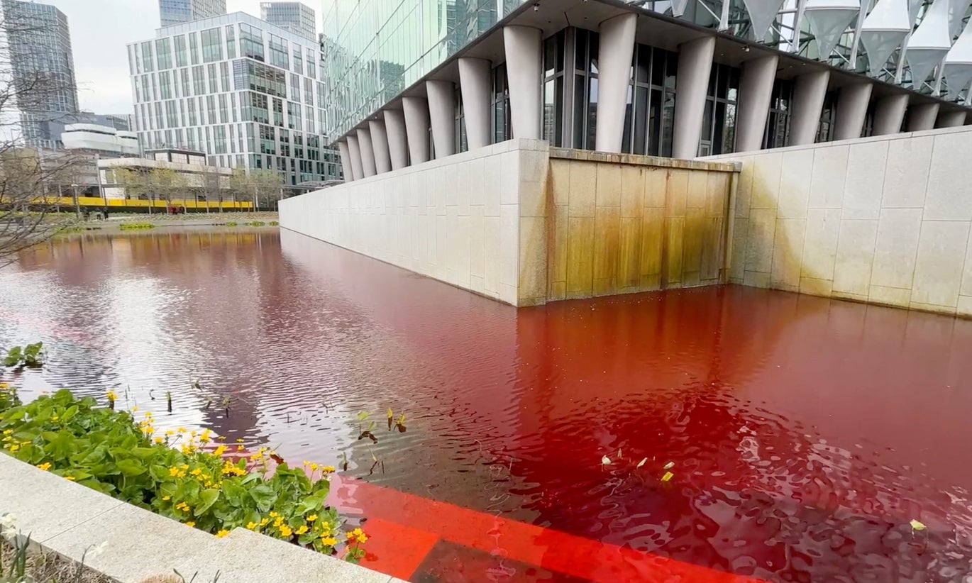 Embaixada dos EUA em Londres com o lago tingido de vermelho-sangue | Foto: Greenpeace via Reuters