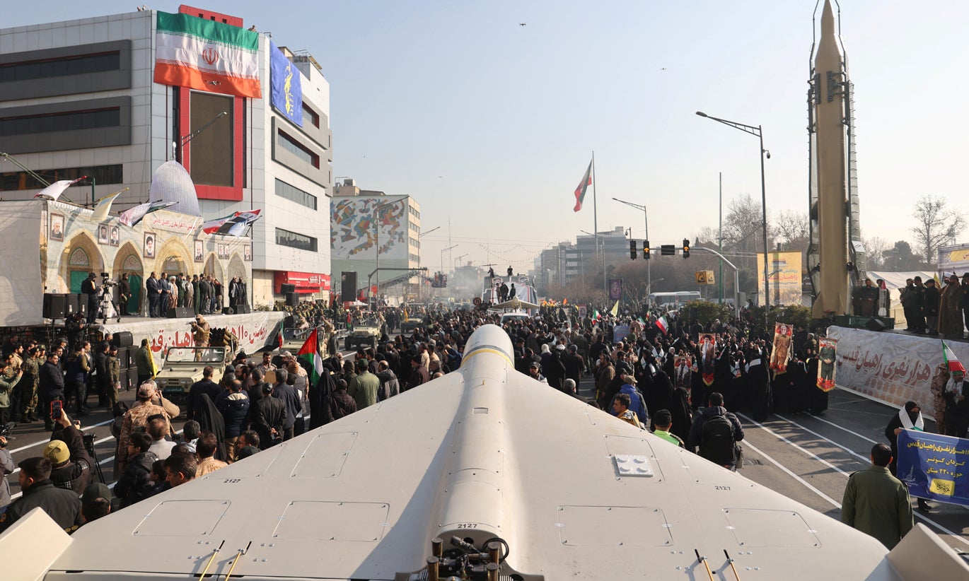 Numa demonstração de força, milhares de milícias Basij trajados para combate desfilaram pelas ruas de Teerão. Junto seguiam centenas de veículos guarnecidos com plataformas de lançamento de rockets, artilharia e comandos navais.
