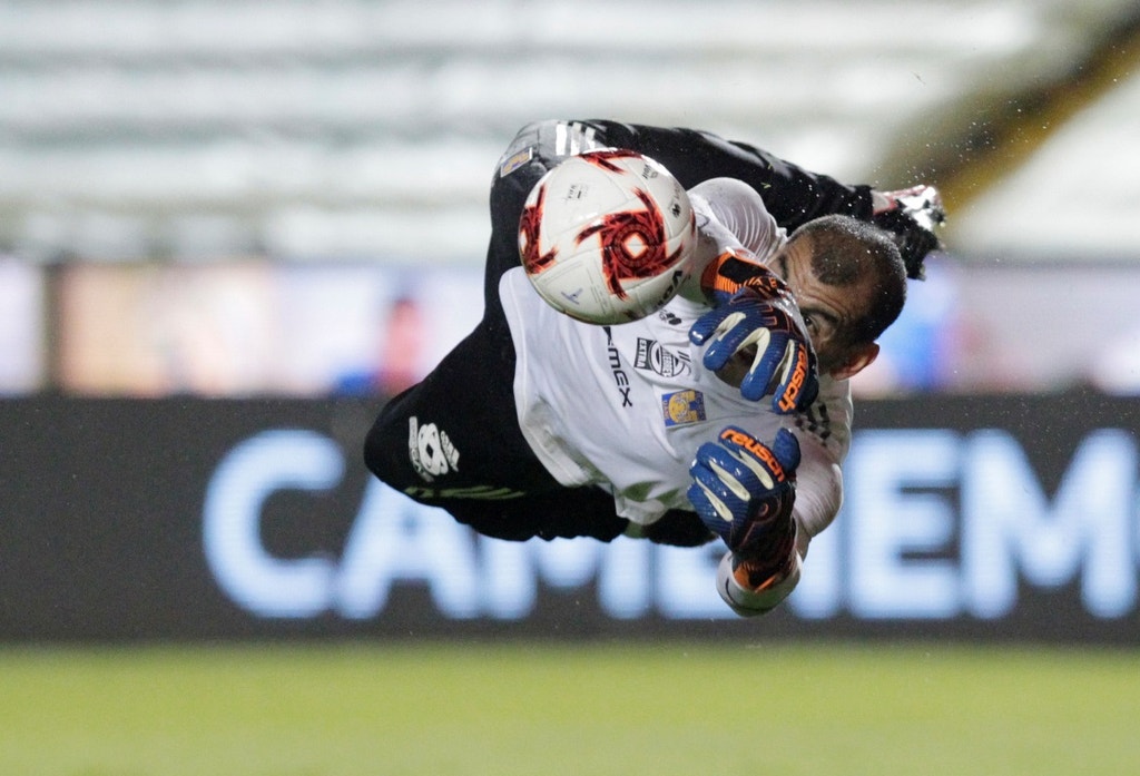 A defesa de Nahuel Guzman registada para a posteridade, na partida entre Tigres e Toluca, em Monterrey, México.