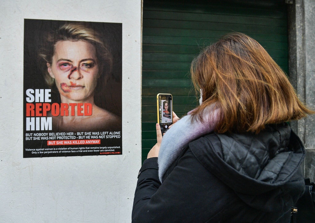 O cartaz é uma representação da presidente da Comissão Europeia, Ursula von der Leyen, como vítima de violência. Faz parte de uma nova série de obras do artista pop e ativista italiano aleXsandro Palombo intitulada "She Reported Him" - Ela denunciou-o.A líder francesa do partido de extrema-direita União Nacional, Marine Le Pen, a presidente da câmara de Paris Anne Hidalgo, a rainha espanhola Letizia e Kamala Harris, vice-presidente norte-americana, também são rostos retratados neste conjunto de obras.A campanha de Palombo pretende denunciar e aumentar a consciencialização sobre a violência doméstica contra as mulheres em todo o mundo. Os cartazes estão espalhados pelas ruas de Milão.
