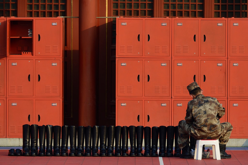 Um soldado do Exército de Libertação do Povo chinês limpa as botas antes do hastear da bandeira nacional em Pequim.