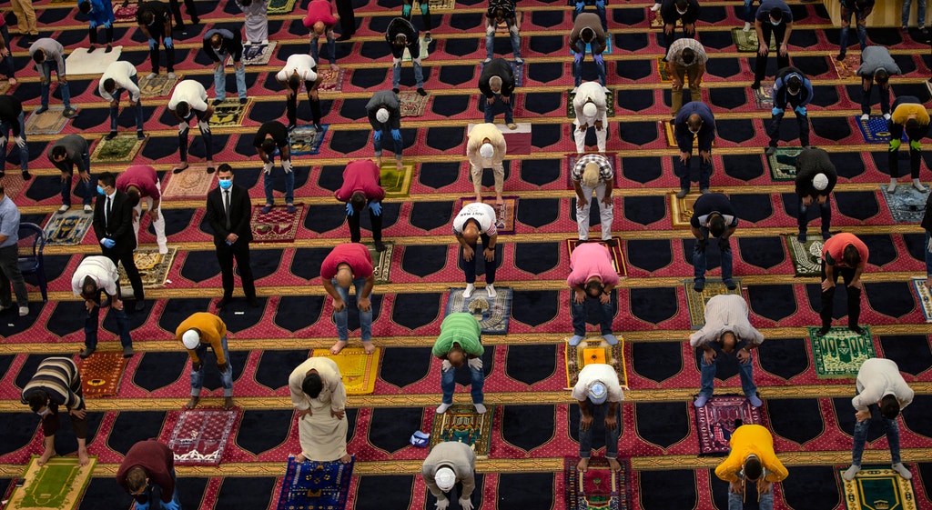 Na Mesquita de al-Amin, situada na baixa de Beirute, o distanciamento social é a regra para estes muçulmanos que oram por ocasião do Edi Al-Fitr.