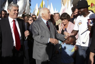 O antigo Presidente da República, Mário Soares, acompanhado pelo secretário-geral do Partido Socialista, José Sócrates José Sena Goulão, Lusa