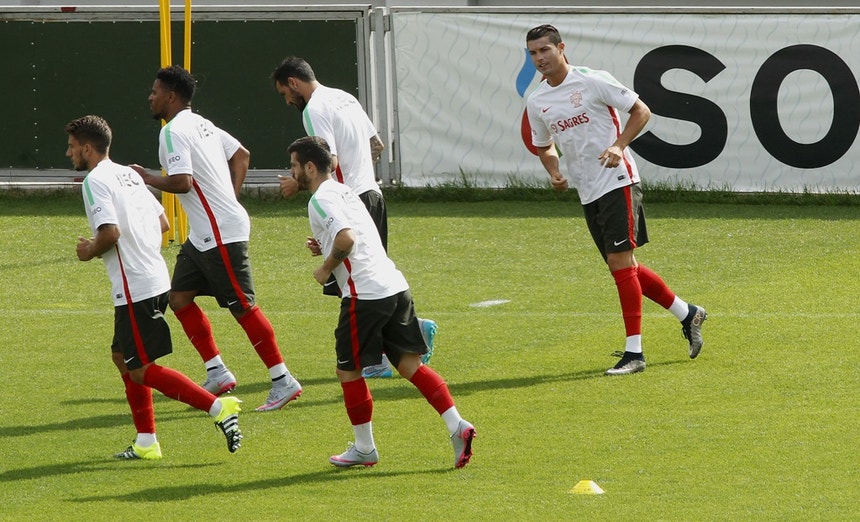 No apronto após a derrota no particular frente à seleção francesa, por 1-0, em Alvalade, os eleitos de Fernando Santos subiram ao relvado do Estádio António Coimbra da Mota, no Estoril, para realizarem o último treino em solo luso antes da partida para a Albânia.