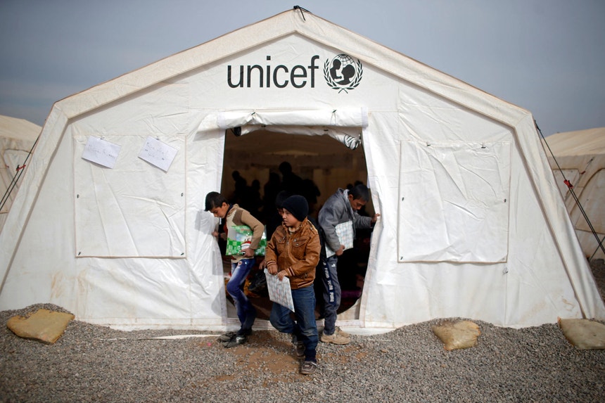 Uma escolada da Unicef improvisada no campo iraquiano de Hassan Sham a leste da cidade de Mossul Mohammed Salem - Reuters