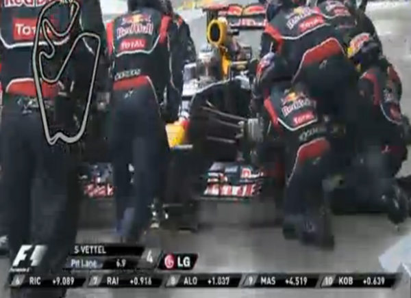 Entre os candidatos ao título, Alonso com o seu pitstop desceu para 12º e Vettel para 17º.