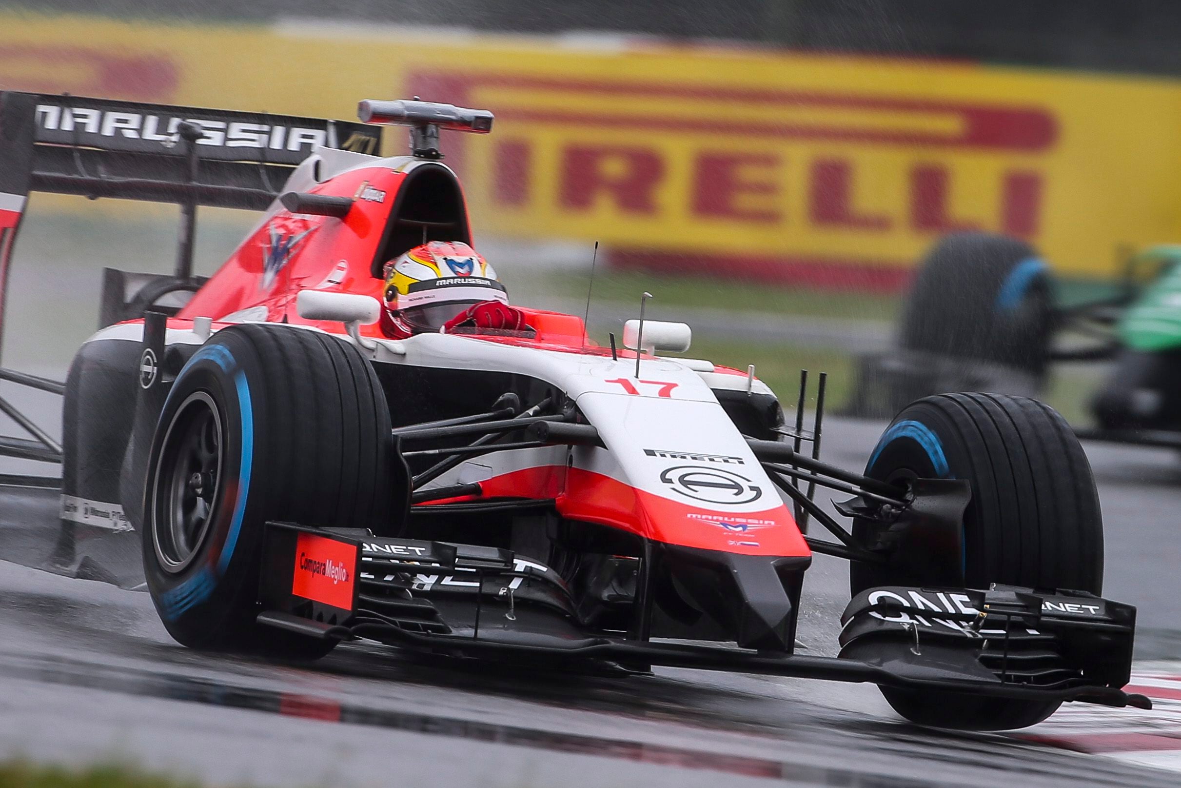 mesmo local, o Marrusia de Jules Bianchi sai de pista para embater