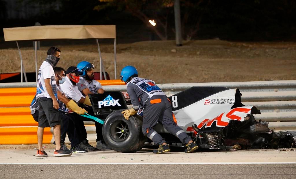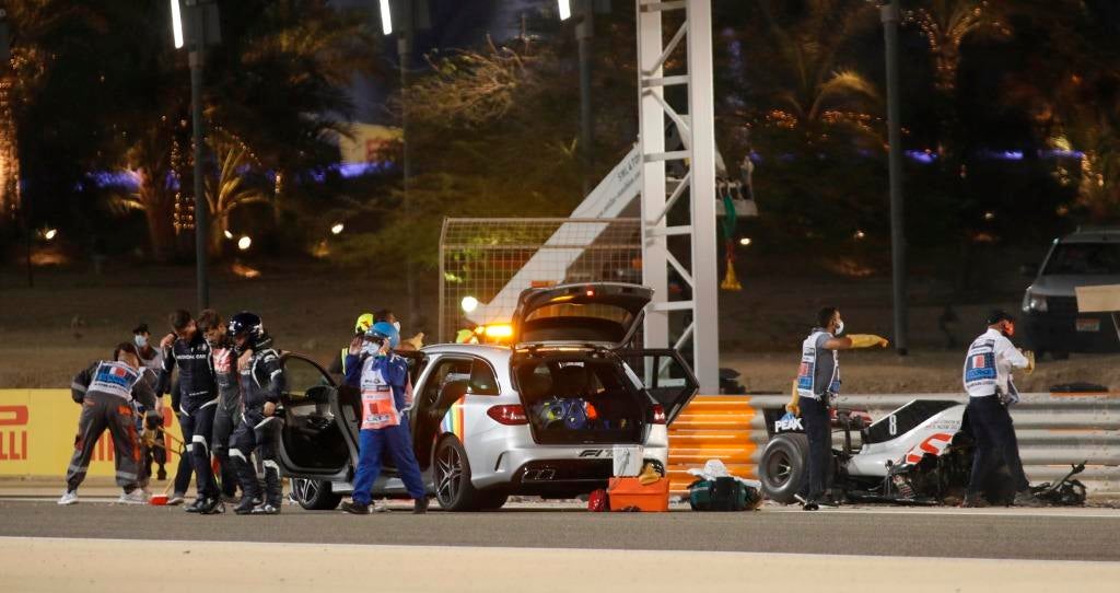 O Haas do piloto francês embateu num dos ‘rails’ de proteção do circuito de Sakhir, provocando uma violenta explosão e obrigando à interrupção imediata da corrida, enquanto Grosjean abandonava o monolugar pelo próprio pé, apesar de combalido.